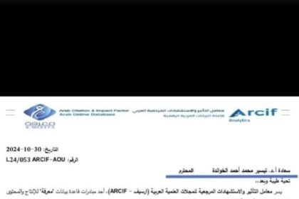 د. عامر الشمري يهنئ الخوالدة بمناسبة دخوله أكبر الموسوعات العالمية في مجال التصنيف البحثي