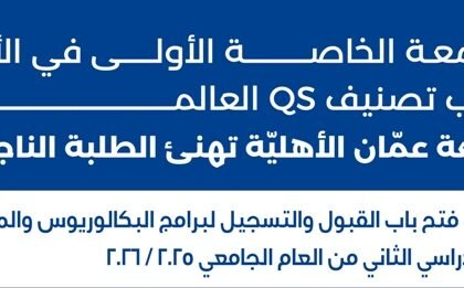 عمان الأهلية تعلن عن استمرار القبول والتسجيل بكافة تخصصات برنامجي البكالوريوس والماجستير