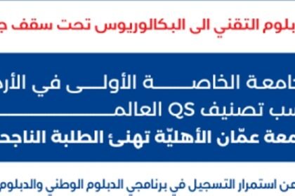 عمان الأهلية تعلن عن استمرار القبول والتسجيل بكلية التعليم التقني ببرنامجي الدبلوم الوطني والدبلوم الدولي