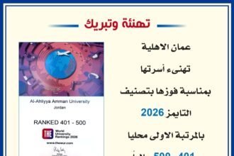 عمان الاهلية تهنىء أسرتها بمناسبة فوزها بتصنيف التايمز 2026 بالمرتبة الاولى محليا و401 – 500 عالميا
