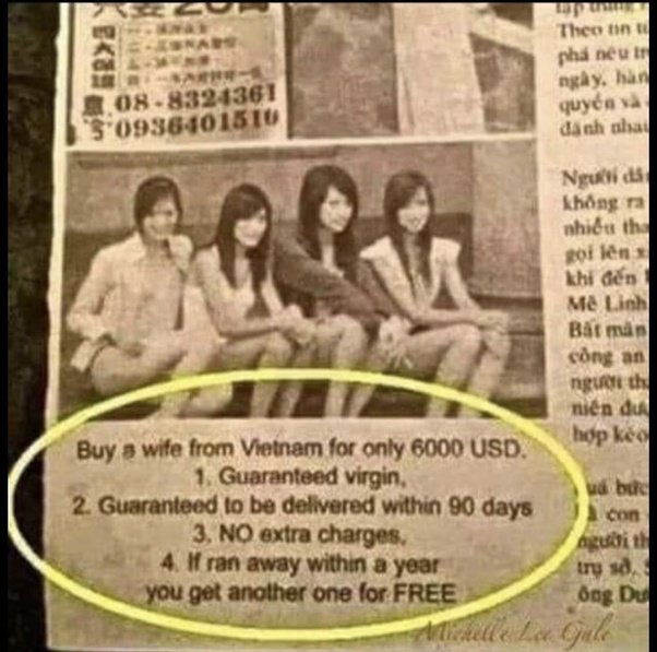 هذا ﺇﻋﻼﻥ ﻓﻲ إﺣﺪى ﺍﻟﺼﺤﻒ ﺍﻷﻣﺮﻳﻜﻴﺔ ﺍﻟﻤﺤﻠﻴﺔ ﻋﻦ ﺑﻴﻊ فتياﺕ ﻣﻦ ﺍﻟﻔﻴﺘﻨﺎﻡ ﻣﻘﺎﺑﻞ 6000 ﺩﻭﻻﺭ ﻓﻘﻂ ﻋﺎﻡ 1966. ﻭﻣﻦ ﻣﺰﺍﻳﺎ ﺍلفتاة أنها ﻋﺬﺭﺍﺀ ﻭﺗﺴﻠﻢ للمشتري ﺧﻼﻝ 90 ﻳﻮﻡ ﻣﻦ ﺩفع اﻠﻤﺒﻠﻎ ﻭهي ﻏﻴﺮ ﻣﻜﻠﻔﺔ اي بدون حقوق كمواطنة أمريكية أي إذا تم اغتصابها او قتلها فالقانون لا يجرم، فقط يغرم بسبب إتلاف ممتلكاتك ﻭﺇﺫﺍ ﻫﺮﺑﺖ ﺧﻼﻝ السنة المتعاقد عليها ﺗﺤﺼﻞ ﻋﻠﻰ فتاة ﺃﺧﺮﻯ ﻣﺠﺎنا ﻛﺎﻥ ﺿﺒﺎﻁ اﻟﺠﻴﺶ ﺍﻷﻣﺮﻳﻜﻲ ﻳﺸﺮﻓﻮﻥ ﻋﻠﻰ ﺷﺒﻜﺎﺕ تجارة البشر وﺍﻟﺪﻋﺎﺭﺓ باﻟﻨﺴﺎﺀ ﺍﻟﻔﻴﺘﻨﺎﻣﻴﺎﺕ ﻓﻲ ﺃﻣﺮﻳﻜﺎ بل ﻭﺗﺼﺪﻳﺮﻫﻦ إلى الخارج ﻛﺎﻟﻴﺎﺑﺎﻥ ﻭﺍﺳﺘﺮﺍﻟﻴﺎ تحت اشراف ﻭﺯﺍﺭﺓ ﺍلحرب ﺍﻻﻣﺮﻳﻜﻴﺔ.