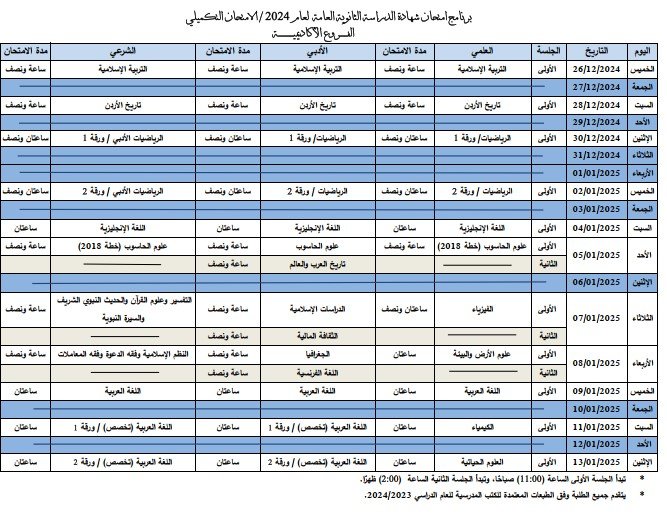أعلنت وزارة التربية والتعليم اليوم جدول امتحان شهادة الدراسة الثانوية العامة لعام 2024 / الامتحان التكميلي، وسيكون أول أيام الامتحان الخميس الموافق 26 كانون أول 2024.