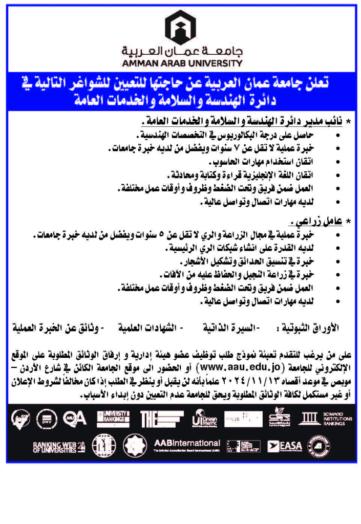 تعلن جامعة عمان العربية عن حاجتها لتعيين شواغر إدارية في دائرة الهندسة والسلامة والخدمات العامة