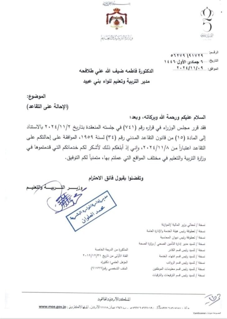 كما قرر مجلس الوزراء في قراره رقم (٧٤١) في جلسته المنعقدة بتاريخ ٢٠٢٤/١١/٢ بالاستناد إلى المادة (١٥) من قانون التقاعد المدني رقم (٣٤) لسنة ١٩٥٩ ، الموافقة على إحالة الدكتورة فاطمه ضيف الله علي طلافحه مدير التربية وتعليم للواء بني عبيد على التقاعد اعتباراً من ۲۰۲٤/۱۱/۸ .