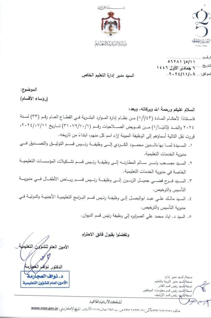 قرر الامين العام للشؤون التعليمية الدكتور نواف العجارمة، نقل التالية أسماؤهم إلى الوظيفة المبينة إزاء اسم كل منهم، ابتداء من تاريخه، وذلك استنادًا لأحكام المادة (١/١/٤٣) من نظام إدارة الموارد البشرية في القطاع العام رقم (۳۳) لسنة ٢٠٢٤ والبند (ثانيا (١) من تفويض الصلاحيات رقم (۳۱۰۷۹/۷۰/۱) تاريخ ٢٠٢٤/٠٧/١١.