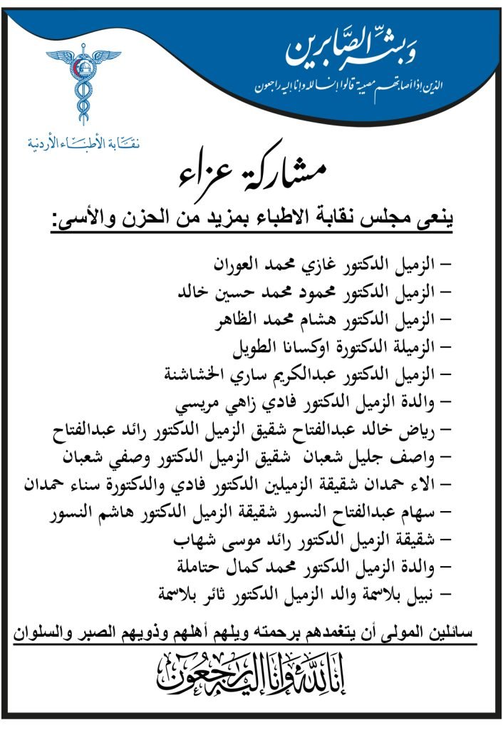 نعت نقابة الأطباء خمسة أطباء اردنيين الذين انتقلوا إلى رحمة الله تعالى خلال الأيام الماضية. والأطباء الراحلون وفقا للنعي المنشور عبر الصفحة الرسمية للنقابة على “فيسبوك” : الدكتور غازي محمد العوران ، والدكتور محمود محمد حسين خالد، والدكتور هشام محمد الظاهر ، والدكتورة اوكسانا الطويل ، والدكتور عبدالكريم ساري الخشاشنة كما نعى مجلس نقابة الأطباء عددا من ذوي الهيئة العامة.