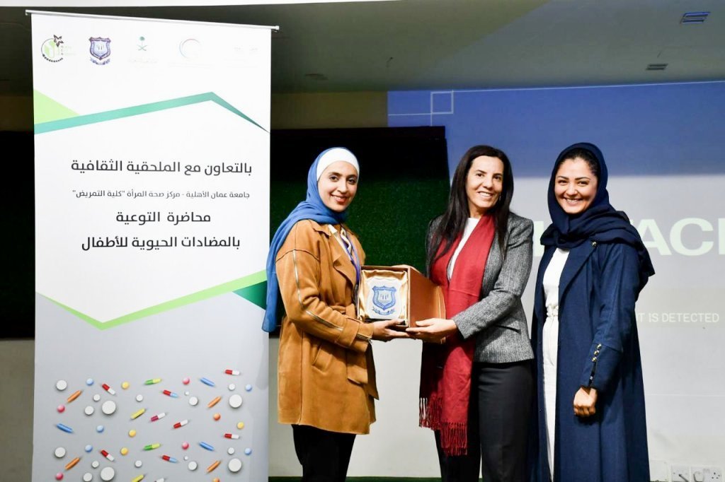 في إطار جهود مركز صحة المرأة التابع لكلية التمريض في جامعة عمان الأهلية لتعزيز التوعية الصحية بين أفراد المجتمع، وبتنظيم مشترك مع الملحقية الثقافية السعودية لدى الأردن، قدمت الصيدلانية حنين المومني محاضرة توعوية بعنوان “المضادات الحيوية وآثارها على الأطفال” في أكاديمية نورث سيتي.