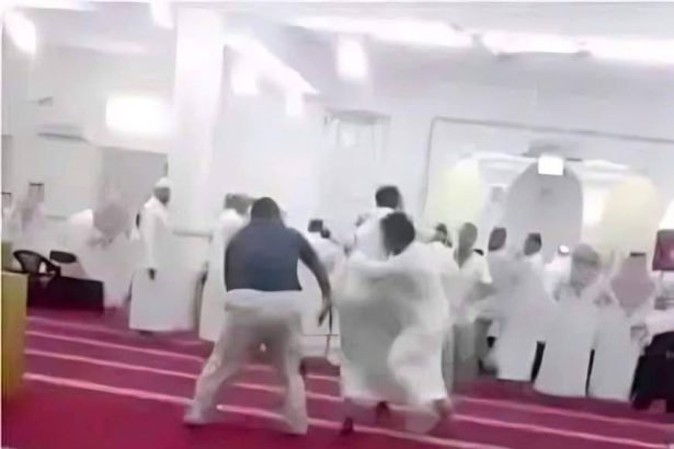 وإذا بزوج المرأة المتوفاة يمسك بخناق مصلٍّ بجانبه يضربه “