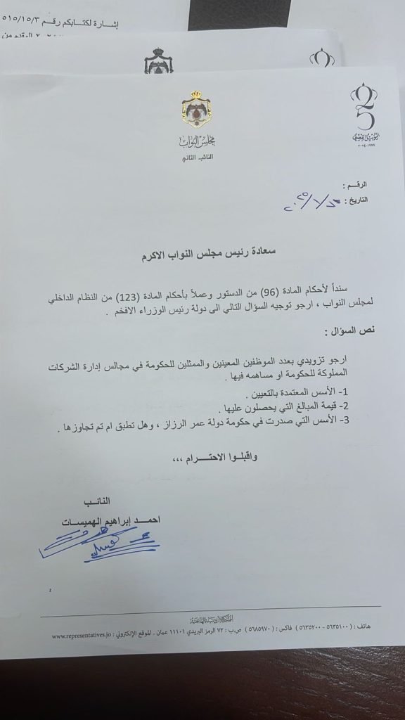 وكان النائب احمد هميسات تقدم بسؤال نيابي لدولة رئيس الوزراء يسأله عن الموظفين في مجالس إدارة الشركات المملوكة للحكومة أو مساهمة فيها، وقيمة المبالغ التي يحصلون عليها، والأسس التي صدرت في حكومة دولة عمر الرزاز وهل تطبق أم تم تجاوزها.