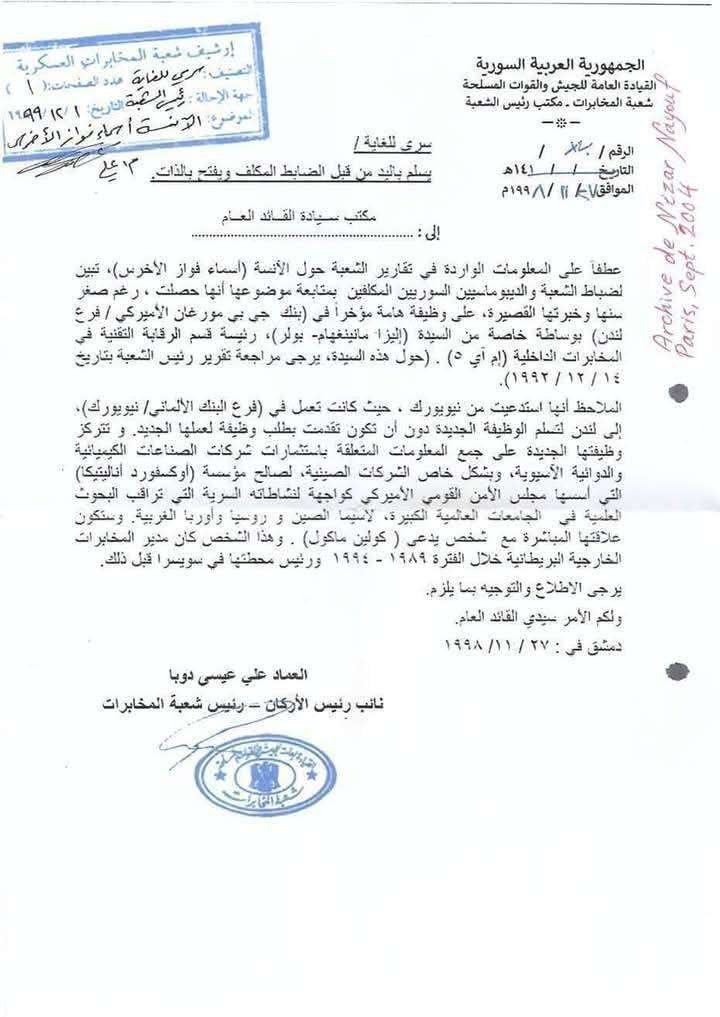 ويشير التقرير إلى أن الضيوف البريطانيين، رغم الطابع الاجتماعي للسهرة، طرحوا أسئلة على «بشار» تتعلق بموقفه من السلام مع إسرائيل والمفاوضات التي كانت بدأت صيف ذلك العام، وما إذا كان يعرف الدكتور «موفق العلاف» (رئيس الوفد السوري في تلك المفاوضات). ـ الوثيقة الثانية التي تحمل تاريخ 27/ 11/ 1998: في هذا التقرير الذي رفعه «علي دوبا» إلى «الأسد الأب» يكشف الضباط والديبلوماسيون، الذين جرى تكليفهم بـ «المراقبة الإيجابية» لابنه و علاقاته مع «آل الأخرس» وابنتهم، أن «إليزا مولر(ضابطة المخابرات التي ورد ذكرها في الوثيقة الأولى) أمّنت وظيفة لـ «أسماء الأخرس» في «بنك مورغان» الأمريكي في لندن، وطلبت منها ترك «البنك الألماني في نيويورك» والعودة إلى لندن للالتحاق بها. أما وظيفتها الجديدة في لندن فكانت مراقبة الاستثمارات الآسيوية، لاسيما الصينية، في قطاع الصناعات الكيميائية والدوائية. وسيكون عليها أن ترفع تقاريرها السرية إلى شخص يدعى «كولين ماكول»، الذي كان آنذاك عضو المجلس الاستشاري في مؤسسة «أوكسفورد أناليتيكا». وكما يذكر التقرير بحق، فإن هذا الشخص كان مدير المخابرات الخارجية البريطانية خلال الفترة 1989- 1994. وزاد : ما يلفت الانتباه إدارياً وأمنياً، في جميع التقارير التي كان يرفعها «دوبا» إلى «الأسد الأب» حول «المراقبة الإيجابية لبشار» هو أن جميعها كانت بلا رقم، واقتصرت على تواريخ الإرسال. ومعنى هذا أنها لم تكن تسجل في سجلات البريد الصادر. وما يؤكد هذا أن جميعها رُوّست بعبارة «سري للغاية، يسلم باليد من قبل الضابط المكلف ويفتح بالذات». و هذا يعني أن ضابطاً كان مكلفاً بنقل هذه التقارير «العائلية» الخاصة من «دوبا» إلى «الأسد». لكن «دوبا» كان حريصاً على وضع نسخ منها في أرشيف الشعبة، الذي – كما أخبرني أحدهم مؤخراً – أقدم النظام على حرقه في محرقة شعبة المخابرات العسكرية في «مدرسة ميسلون للمخابرات» بريف دمشق بعد عودة بشار من موسكو بتاريخ 1 كانون الأول/ ديسمبر الماضي. وهو ما أقدمت عليه الأجهزة الأخرى (مكتب الأمن الوطني/ القومي، إدارة المخابرات الجوية، إدارة المخابرات العامة، القصر الجمهوري، بعض الدوائر المدنية ..إلخ)، حيث حرقت أراشيفها الورقية الحساسة في الفترة نفسها في «محرقة إدارة المخابرات العامة» و «محرقة رئاسة الأركان»، فضلاً عن تدمير الحافظات (الهارديسكات الخارجية) التي تحتفظ بالوثائق الرقمية بعد أتمتة مؤسسات الدولة المدنية والعسكرية.