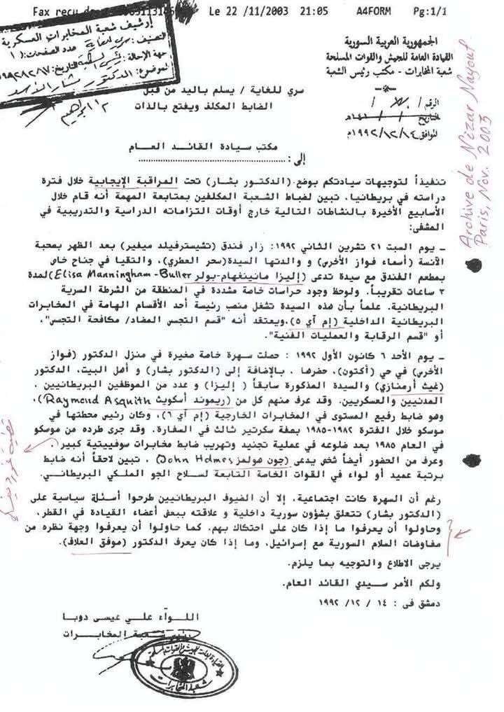 وقال نيوف: إن زواج أسماء الأخرس من بشار أسد لم يكن نتيجة علاقة حب مزعومة، بل مجرد «زواج استخباري – وظيفي» وتابع: «الأسد الأب» لم يجد سوى «علي دوبا» ليكلفه بعملية «مراقبة إيجابية» (كما أسموها في الوثائق الرسمية) لابنه «بشار» خلال دراسته في بريطانيا. وتابع في منشوره : في الأرشيف الخاص بـ «بشار الأسد» في شعبة المخابرات العسكرية وحده، أكثر من عشرين وثيقة ذات صلة، واليوم سأتطرق إلى وثيقتين تفصل بينهما ست سنوات. الأولى تعود إلى أواخر العام 1992، أي بعد وصول «بشار» إلى لندن بفترة قصيرة كما أفترض؛ والثانية تعود إلى أواخر العام 1998، وتتعلق بـ «أسماء الأخرس» وحدها، بعد أن جيء بها على غفلة من نيويورك إلى لندن لتشغل وظيفة بنكية لصالح المخابرات البريطانية!. ـ الوثيقة الأولى التي تحمل تاريخ 14/ 12/ 1992 : يشير محتواها إلى أن «بشار» تناول الغداء في جناح خاص في مطعم فندق «تشيستفيلد ميفير» عصر يوم السبت 21 تشرين الثاني/ نوفمبر 1992 بصحبة كل من «سحر العطري» (حماته المستقبلية) وابنتها «أسماء». وكان معهم سيدة تدعى «إليزا مانينغهام- بولر»، التي وصفها التقرير بأنها رئيس قسم هام في المخابرات الداخلية البريطانية ( إم آي 5). وبعد ذلك بحوالي أسبوعين، حصلت سهرة اجتماعية خاصة في منزل الدكتور «فواز الأخرس» (حماه المستقبلي) في حي «أكتون»، حضرها بالإضافة إلى أفراد العائلة و السيدة المذكورة آنفاً ( إليزا بولر) كل من الدكتور «غيث أرمنازي» وعدد من الشخصيات المدنية والعسكرية البريطانية، عرف منهم «ريموند أسكويث» الذي وصفه التقرير بأنه ضابط في المخابرات الخارجية (إم آي 6) ورئيس سابق لمحطتها في موسكو، وبأنه تورط في قضية تجنيد وتهريب ضابط مخابرات سوفييتي (يقصد قضية «اوليغ غورديفسكي» الشهيرة، التي دفعت سلطات موسكو إلى طرده في العام 1985). وشارك في السهرة أيضاً شخص يدعى «جون هولمز» الذي وصفه التقرير بأنه ضابط كبير في القوات الخاصة في سلاح الجو الملكي البريطاني.