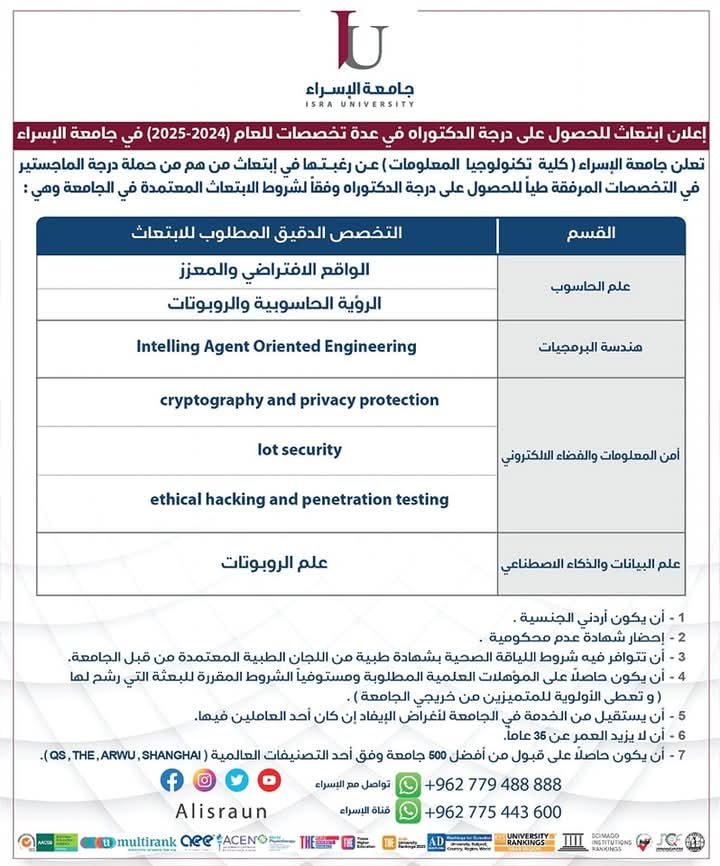 إعلان ابتعاث للحصول على درجة الدكتوراه في عدة تخصصات – كلية تكنولوجيا المعلومات للعام (2024-2025) في جامعة الإسراء