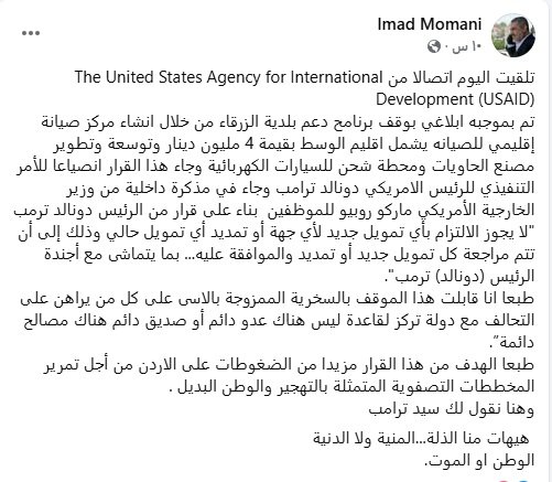 وكالة تليسكوب الإخبارية – صرّح رئيس بلدية الزرقاء الكبرى، المهندس عماد المومني، عبر منشور له على صفحته الخاصة على موقع التواصل الاجتماعي، أن الوكالة الأمريكية للتنمية الدولية (USAID) أبلغته بقرار وقف تمويل برنامج دعم بلدية الزرقاء، والذي يشمل إنشاء مركز صيانة إقليمي بقيمة 4 ملايين دينار، بالإضافة إلى توسعة مصنع الحاويات ومحطة شحن السيارات الكهربائية.