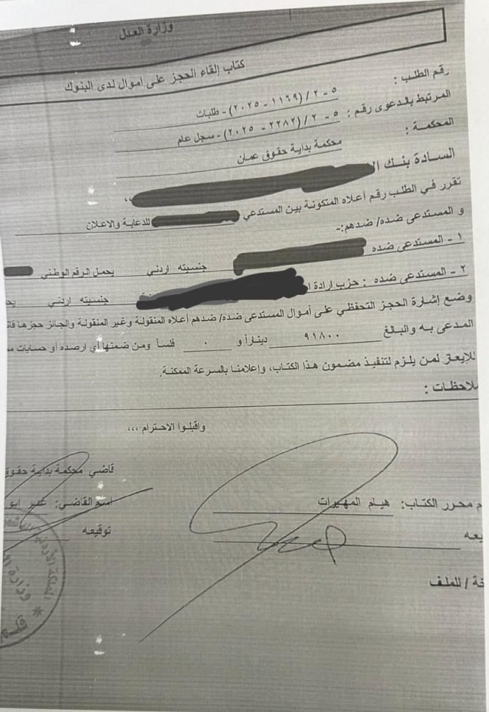 اصدرت محكمة بداية حقوق عمان الحجز التحفظي على اموال حزب ارادة ومرشحه في القائمة الوطنيه لحزب اراده بالانتخابات النيابيه السابقه .