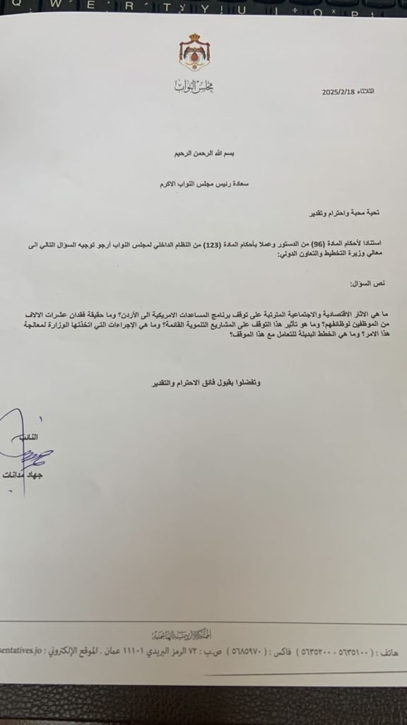 وجه النائب جهاد مدانات، سؤالا نيابيا إلى وزيرة التخطيط والتعاون الدولي، بشأن الآثار الاقتصادية والاجتماعية المترتبة على توقف برنامج المساعدات الأميركية إلى الأردن. وتاليا نص السؤال: ما هي الآثار الاقتصادية والاجتماعية المترتبة على توقف برنامج المساعدات الأمريكية الى الأردن؟ وما حقيقة فقدان عشرات الآلاف من الموظفين لوظائفهم؟ وما هو تأثير هذا التوقف على المشاريع التنموية القائمة؟ وما هي الإجراءات التي اتخذتها الوزارة لمعالجة هذا الأمر؟ وما هي الخطط البديلة للتعامل مع هذا الموقف؟.