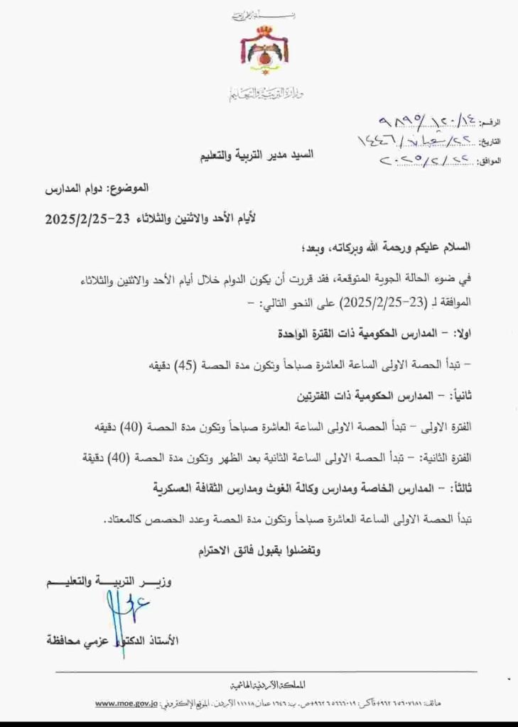 في ضوء الحالة الجوية المتوقعة، وحفاظا على سلامة الطلبة، قرر وزير التربية والتعليم الدكتور عزمي محافظة أن يكون الدوام خلال أيام، الأحد والاثنين والثلاثاء تاريخ 23-25/2/2025 على النحو التالي: