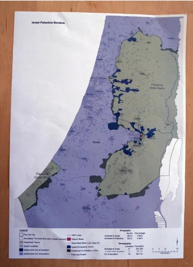 تظهر الخريطة أن أولمرت كان مستعدا، بشكل عام، للعودة إلى حدود ما قبل عام 1967، لكنه أراد الاحتفاظ بكتلة مستوطنات غوش عتصيون جنوب القدس، ومدينة معاليه أدوميم الاستيطانية شرقا، بالإضافة إلى جزء من الضفة الغربية يضم مستوطنة أريئيل الكبيرة في منطقة الضفة الغربية. وفي المقابل، كانت إسرائيل “ستتنازل عن بعض أراضيها” لصالح الدولة الفلسطينية الجديدة.