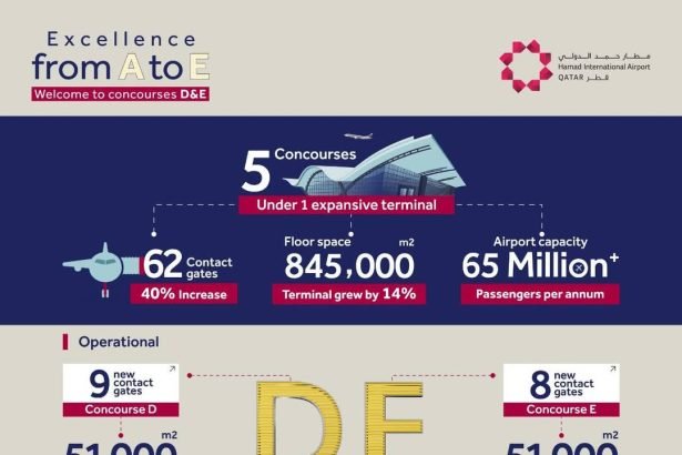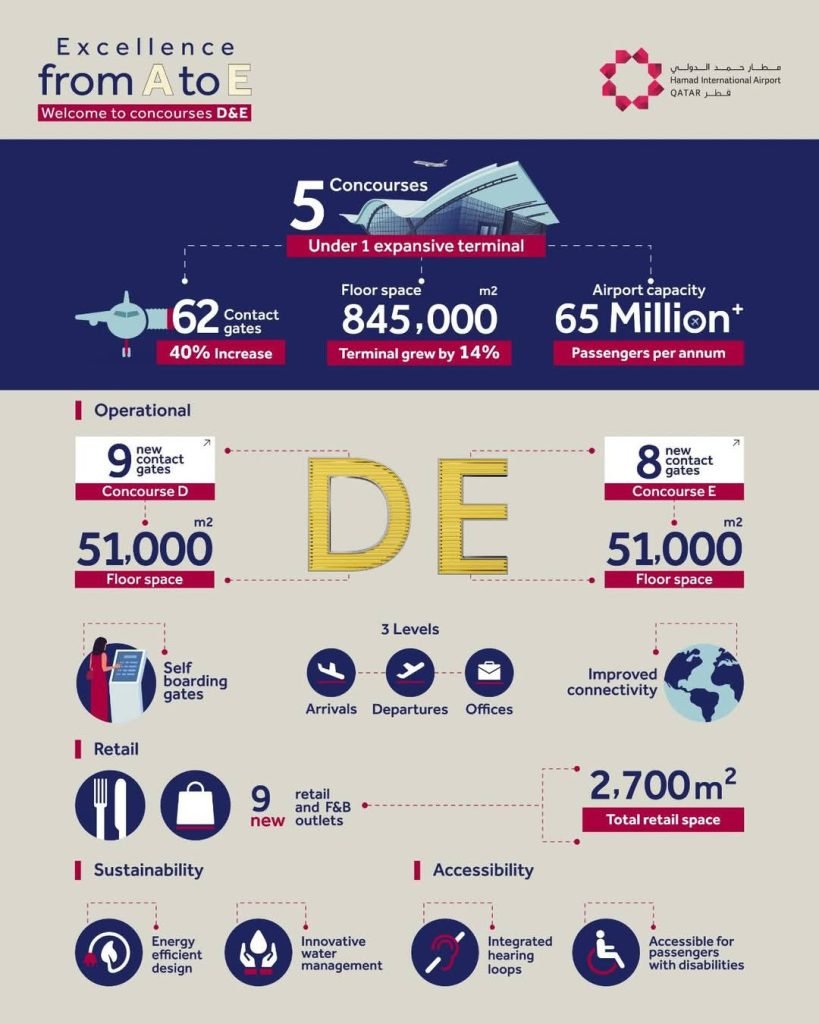 افتتح مطار حمد الدولي، المصنف كأفضل مطار بالعالم وأفضل مطار للتسوق وفقاً لجوائز سكاي تراكس العالمية 2024، رسمياً منطقتي الكونكورس (D) و(E) ، مما يمثل علامة بارزة في مسيرة توسعته وزيادة طاقته الاستيعابية إلى أكثر من 65 مليون مسافر سنوياً.