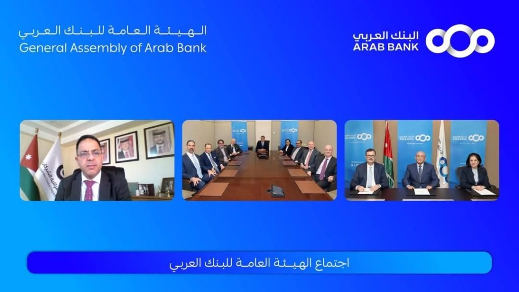 عقدت الهيئـة العامـة العادية لمساهمي البنك العربي اجتماعها بواسطة وسيلة الاتصال المرئي والإلكتروني، برئاسة السيد صبيح المصري – رئيس مجلس الإدارة وبحضور أعضاء مجلس الإدارة والمدير العام التنفيذي ومساهمين يحملون أسهما «أصالة وإنابة ووكالة» يشكلون حوالي 79.06% من رأس المال، كما وحضر الاجتماع مراقب عام الشركات عطوفة الدكتور وائل العرموطي ومندوبي البنك المركزي الأردني.