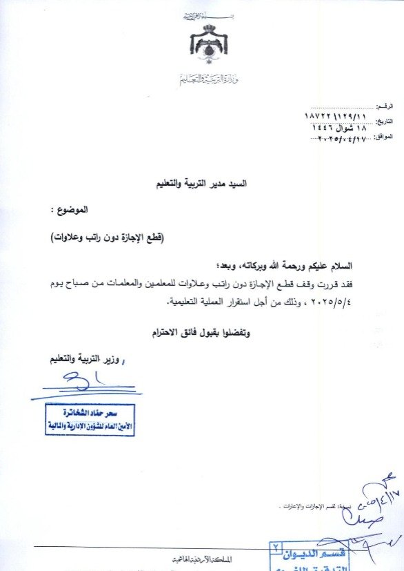 قررت وزارة التربية والتعليم وقف قطع الاجازة بدون راتب وعلاوات للمعلمين والمعلمات بدءا من صباح يوم 4/5/2025.