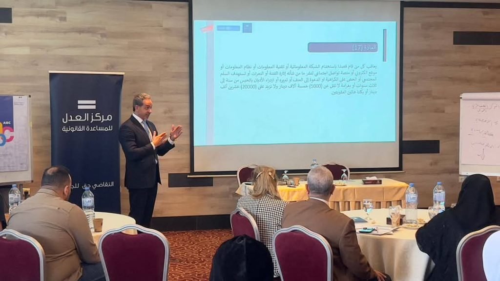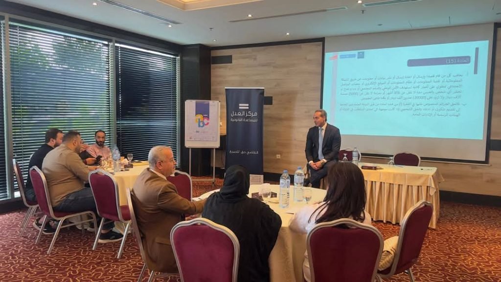خلال الورشة التدريبية التي عقدها مركز العدل للمساعدة القانونية حول قانون الجرائم الإلكترونية و تطبيقاته