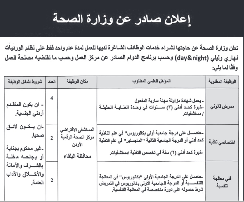 تليسكوبفرص عمل وظائف شاغرة في وزارة الصحة Last updated: مايو 1, 2025 2:24 م dawoud Share 0 Min Read SHARE وكالة تليسكوب الاخبارية You Might Also Like الأردن يشارك في معرض ITB برلين 2026 ويوقع اتفاقيتي طيران عارض الأردن السيادة أولًا… والبقية تفاصيل رونالدو غادر السعودية بطائرته الخاصة بسبب الهجمات الإيرانية ارتفاع ضغط الدم: تحديات التشخيص وفجوة الالتزام بالعلاج بنك صفوة الإسلامي يطلق برنامج تمويل السيارات مع خدمات متكاملة Sign Up For Daily NewsletterBe keep up! Get the latest breaking news delivered straight to your inbox.[mc4wp_form]By signing up, you agree to our Terms of Use and acknowledge the data practices in our Privacy Policy. You may unsubscribe at any time. Share This Article Facebook Twitter Whatsapp Whatsapp Telegram Email Copy Link Print Share Previous Article مطلوب معلمين ومعلمات واداريين من جميع التخصصات للعمل في مدراس دولية خاصة بالعاصمة عمان Next Article وظائف شاغرة في وزارة الاوقاف