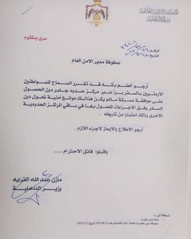 قرر وزير الداخلية مازن الفراية السماح للمواطنين الأردنيين بالسفر برا عبر مركز حدود جابر دون الحصول على موافقة مسبقة .