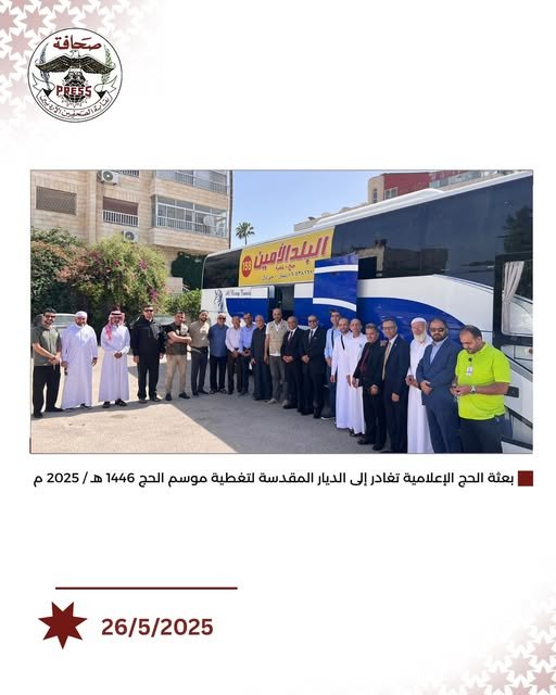 غادرت بعثة الحج الإعلامية صباح الاثنين، إلى الديار المقدسة لتغطية موسم الحج لعام 1446/ 2025 برئاسة الزميل راشد الرواشدة.