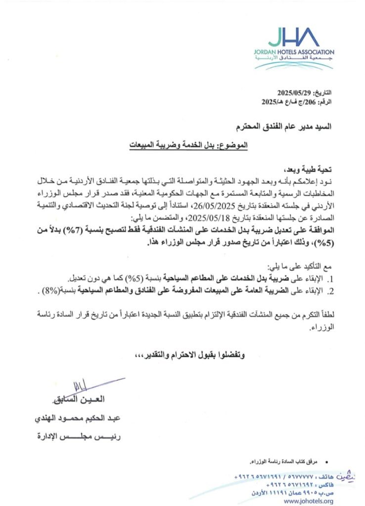 ثمّن رئيس جمعية الفنادق الأردنية العين السابق المهندس عبدالحكيم محمود الهندي وأعضاء مجلس إدارة الجمعية، قرار مجلس الوزراء الأخير بتعديل ضريبة الخدمة في المنشآت الفندقية الأردنية من 5% إلى 7%.