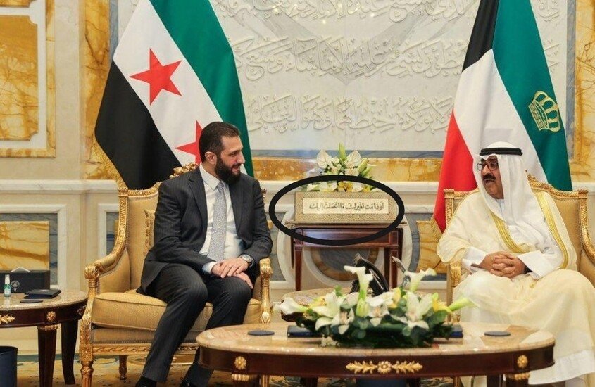 أثارت جملة مكتوبة على لافتة في القصر الأميري الكويتي، خلال الاجتماع بين أمير الكويت، الشيخ مشعل الأحمد الجابر الصباح، والرئيس السوري أحمد الشرع، تفاعلاً واسعًا وحالة من الجدل على منصات التواصل الاجتماعي.