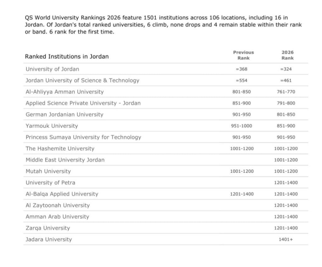 وفي هذا السياق، صرح رئيس الجامعة الأستاذ الدكتور ساري حمدان: إننا نفخر بهذا الإنجاز النوعي الذي يُضاف لسجلّ الجامعة الحافل بالانجازات، ونعتزّ بهذا الترتيب المتقدم الذي يعكس الجهود المتكاملة التي تبذلها جميع كليات ووحدات الجامعة لتحقيق هذا التميّز.