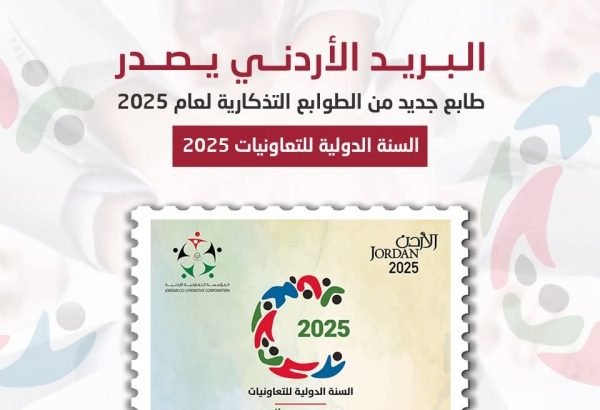 أعلن البريد الأردني عن طرح إصدار جديد من الطوابع التذكارية لعام 2025 بعنوان “السنة الدولية للتعاونيات 2025” للبيع للجمهور ولهواة الطوابع، اعتبارا من اليوم الأحد.