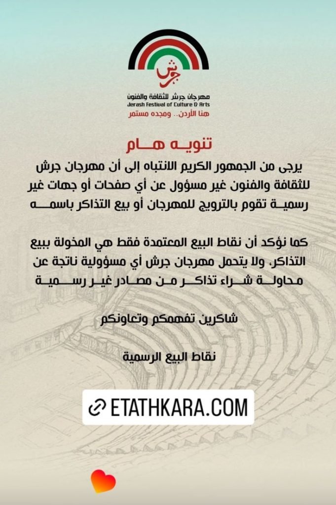 ودعت الادارة في بيان صحفي إلى أخذ الحيطة والحذر من هذه الصفحات او الجهات غير الرسمية، مؤكدة أن التذاكر الرسمية لكافة فعاليات مهرجان جرش للثقافة والفنون متوفرة من خلال الموقع الإلكتروني ETATHKARA.COM.