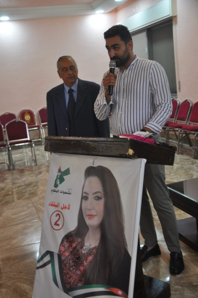 وتحدثت المرشحة ريما الجغبير وعدد من الشخصيات السياسية والاقتصادية والاعلامية وبعض أعضاء قائمة “نشميات البلقاء” وأعلنوا تأييدهم للمرشحة الجغبير وقائمة “نشميات السلط” عن رؤيتهم للعمل البرلماني والذي ينطلق من الثوابت الوطنية ويحمل افكار قابلة للتطبيق والقياس في كافة المجالات الاقتصادية والاجتماعية والسياسية.