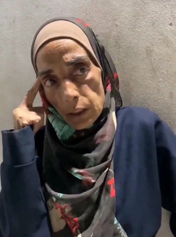 سيدة من غزة تخاطب العالم الصامت، وجسدها الهزيل يبدو كهيكل عظمي من شدة الجوع.