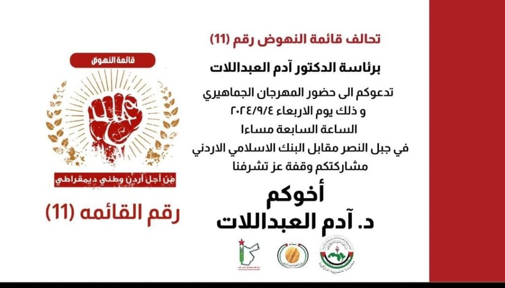 يقيم تحالف قائمة النهوض رقم (11) برئاسة الدكتور آدم العبداللات ، الأربعاء المقبل، مهرجانا جماهيريا في منطقة جبل النصر بالعاصمة عمّان.