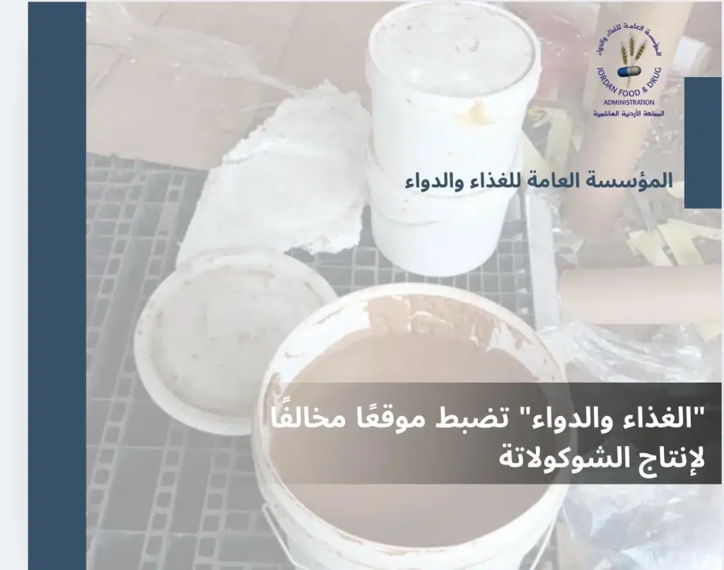 ضبطت مؤسسة الغذاء والدواء، وبالتعاون مع الإدارة الملكية لحماية البيئة، موقعًا مخالفًا يستخدم لإنتاج الشوكولاتة متنوعة النكهات معبأة في عبوات بلاستيكية”سطل” على أرض فارغة ضمن منطقة سكنية، جنوب عمان، وذلك ضمن الجولات الرقابية التي تنفذها المؤسسة .