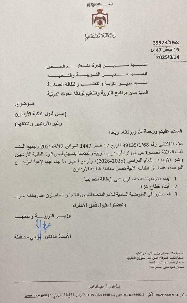 ألغى وزير التربية والتعليم، الدكتور عزمي محافظة، قراره السابق بخصوص تطبيق أسس قبول الطلبة الأردنيين وغير الأردنيين للعام الدراسي (2025/ 2026).
