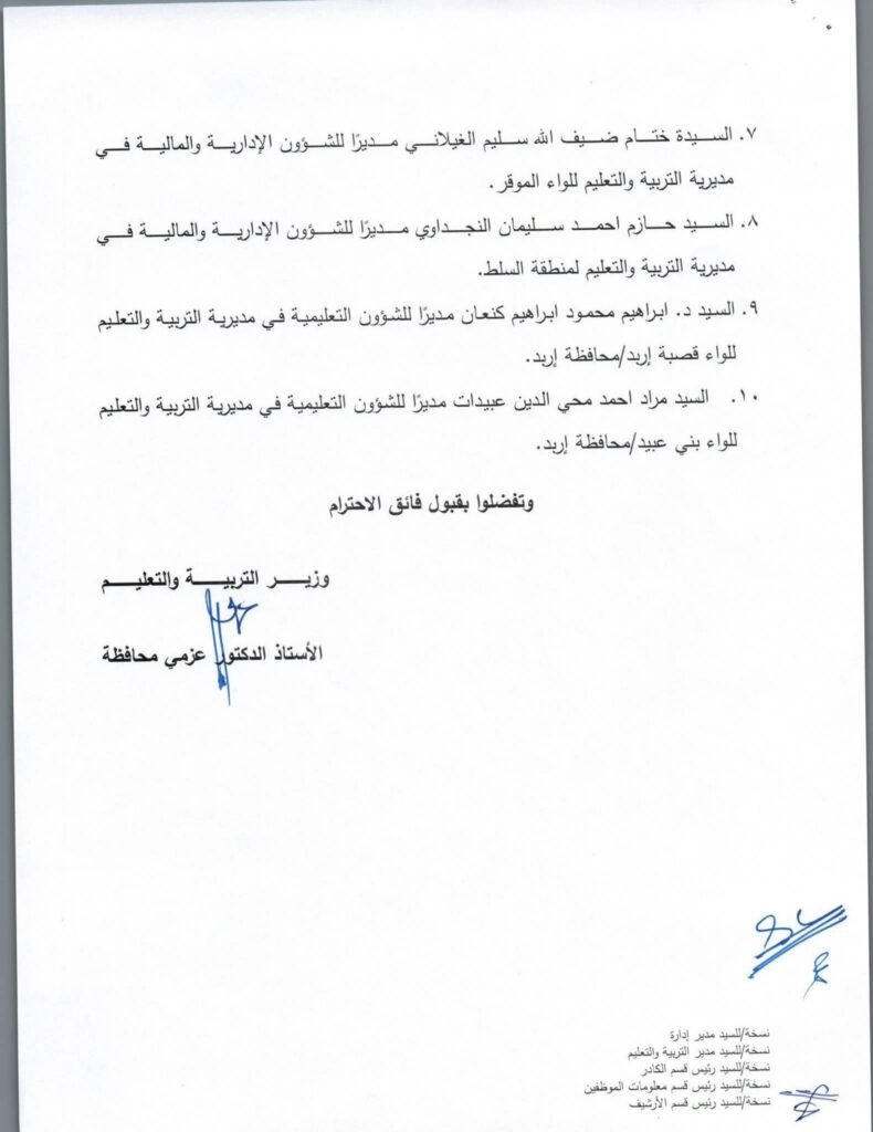 أعلنت وزارة التربية والتعليم عن تشكيلات ادارية بتعين مدراء مديريات في بعض المحافظات
