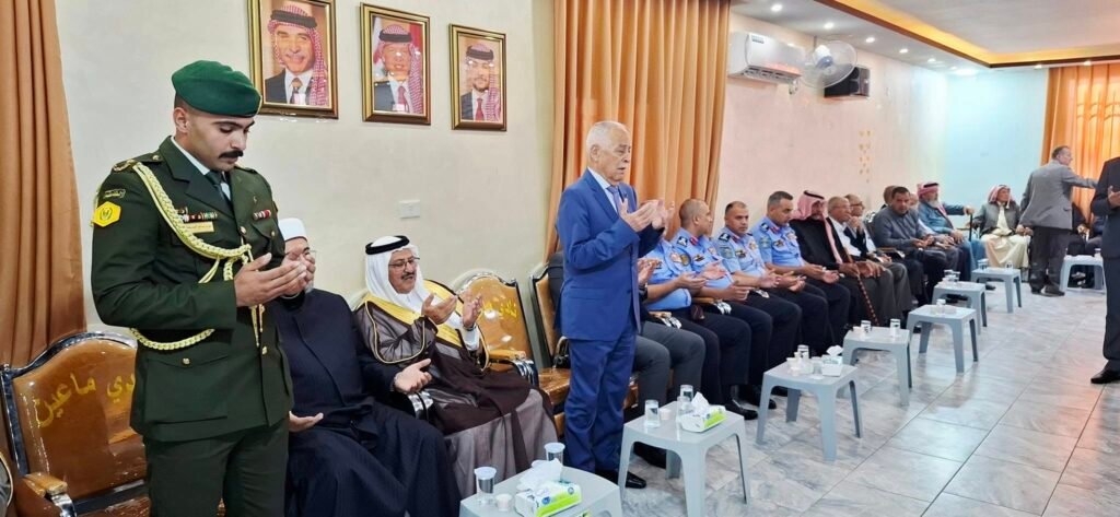 *وفي منطقة الفيصلية (دوار الطيارة)، بمحافظة مادبا*، نقل العيسوي، خلال زيارته بيت عزاء المرحوم الحاج عبدالله زعل الشياب، تعازي ومواساة جلالة الملك وسمو ولي العهد، إلى ذوي الفقيد وعموم عشيرة الشياب، سائلا المولى عز وجل أن يتغمده بواسع رحمته.