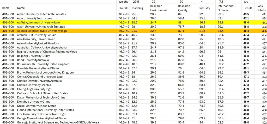 منعاً للتشويش والتضارب بنشرالأخبار حول نتائج تصنيف التايمز 2026 محلياً، تؤكد جامعة عمان الأهلية فوزها بالمركز الأول محليا ً، حيث جاءت في المرتبة 441 وبفارق 54 مرتبة عمن حل في المركز الثاني محلياً ضمن الفئة 401 – 500 عالمياً وفق الجدول المرفق الذي يوضح مجموع النقاط والمرتبة لكل جامعة ” بالتفصيل “.