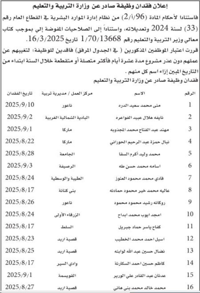 أعلنت وزارة التربية والتعليم، اليوم الاثنين، عن اعتبار مجموعة من المعلمين والموظفين فاقدين لوظائفهم، نظراً لتغيبهم عن عملهم دون عذر مشروع لمدة 10 أيام أو أكثر خلال العام الجاري. وتاليا الأسماء: