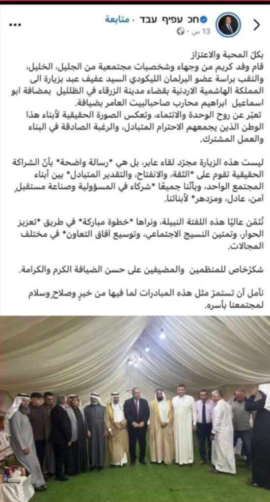 الصور المنشورة أظهرت عبد برفقة وفد قال إنه يضم “وجهاء من الجليل والخليل والنقب”، خلال زيارته إلى الأردن، فيما نشر عبر صفحته الرسمية منشورا وصف فيه الزيارة بأنها “رسالة محبة ووحدة وانفتاح”، مشيدا بحفاوة الاستقبال وما اعتبره “نموذجا للتعاون والحوار بين الشعوب”.