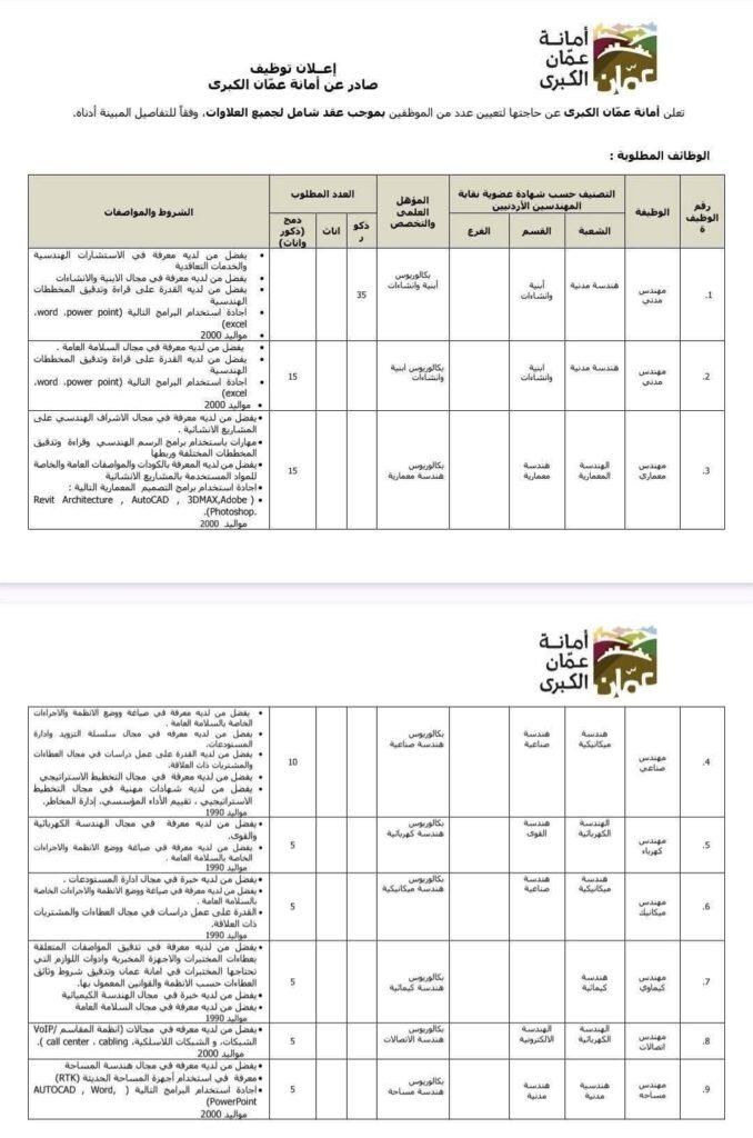 أعلنت امانة عمان الكبرى عن وظائف هندسية ووظائف متنوعة شاغرة لديها وفق التالي: