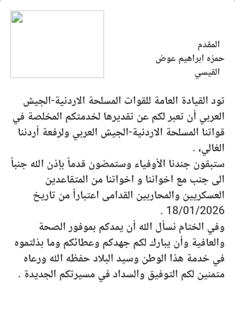 كل الأمنيات بالتوفيق والنجاح في رحلتك القادمة بعد مسيرة حافلة بالعطاء في صفوف القوات المسلحة الأردنية – سلاح الجو الملكي