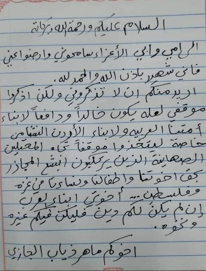 نفت عائلة الشهيد ماهر الجازي منفذ عملية الجسر أمس الاثنين، الوصية المنسوبة لابنهم ماهر.