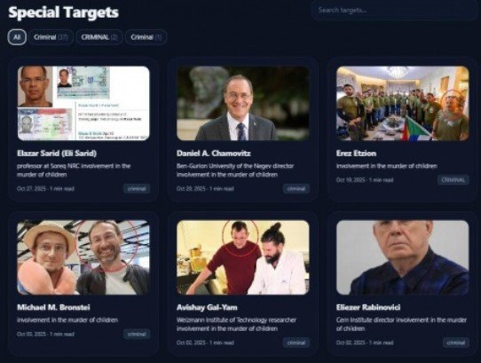 ونشر موقع يسمى “حركة العقاب من أجل العدالة” تهديدات مستهدفة بقتل كبار الأكاديميين الإسرائيليين، ويقدمهم باعتبارهم “مجرمين ومتعاونين مع جيش الاحتلال”، و”موزعين لأسلحة الدمار الشامل للجيش الإسرائيلي”، و”متورطين في قتل الأطفال الفلسطينيين”.
