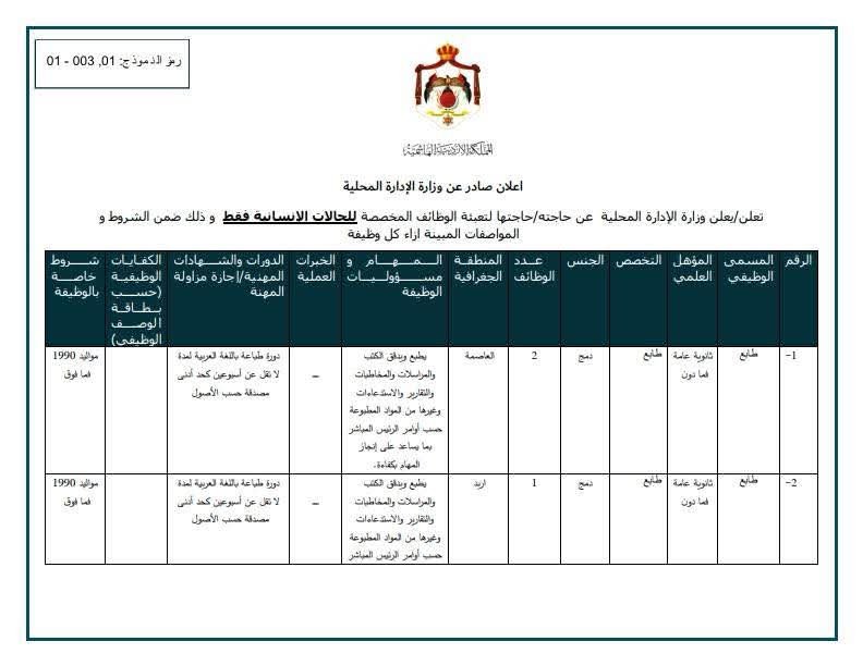 تُعلن وزارة الإدارة المحلية عن فتح باب التقدّم لعدد من الوظائف المخصّصة “للحالات الإنسانية فقط”، وذلك ضمن الشروط والتعليمات المحددة في الجداول المرفقة