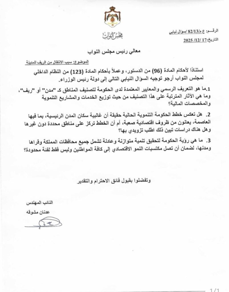 2. هل تعكس خطط الحكومة التنموية الحالية حقيقة أن غالبية سكان المدن الرئيسية، بما فيها العاصمة، يعانون من ظروف اقتصادية صعبة، أم أن الخطط تركز على مناطق محددة دون غيرها وهل هناك دراسات تبين ذلك اطلب تزويدي بها؟ 3. ما هي رؤية الحكومة لتحقيق تنمية متوازنة وعادلة تشمل جميع محافظات المملكة وقراها ومدنها، لضمان أن تصل مكتسبات النمو الاقتصادي إلى كافة المواطنين وليس فقط لفئة محدودة؟