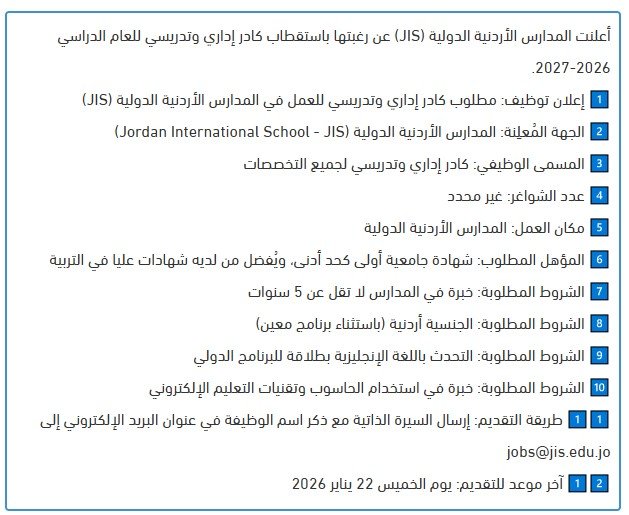 فرص عمل مطلوب معلمين ومعلمات للعمل لدى مدارس كبرى بالعاصمة عمان Last updated: يناير 13, 2026 3:31 م dawoud Share 0 Min Read SHARE وكالة تليسكوب الاخبارية You Might Also Like فرص تعليمية شاغرة للعمل في كبرى المدارس وظائف للاناث فقط مطلوب للعمل لدى لكبرى المدارس الدوليه في السعوديه – جده مطلوب للعمل لدى لكبرى المدارس الدوليه في السعوديه جده مطلوب للعمل لدى لكبرى المدارس الدوليه في السعوديه جده Sign Up For Daily NewsletterBe keep up! Get the latest breaking news delivered straight to your inbox.[mc4wp_form]By signing up, you agree to our Terms of Use and acknowledge the data practices in our Privacy Policy. You may unsubscribe at any time. Share This Article Facebook Twitter Whatsapp Whatsapp Telegram Email Copy Link Print Share Previous Article حكمت الهجري لصحيفة يديعوت أحرونوت : علاقتنا بإسرائيل سبقت سقوط الأسد وهناك روابط دم وأسرة مع دروز الجولان Next Article مطلوب سائق صباحي / مسائي شفتات – فئة رابعة